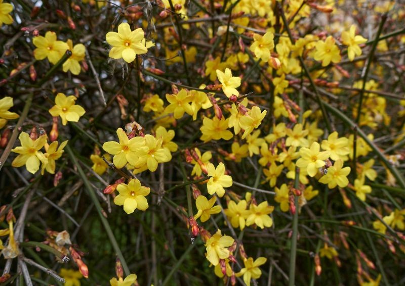 Jaśmin nagokwiatowy (Jasminum nudiflorum) należy do rodziny oliwkowatych i naturalnie występuje w Chinach, a do Europy trafił w połowie XIX wieku. W Polsce zazwyczaj dorasta do 1,5–2 metrów wysokości. To krzew, który może przybierać różne formy — czasem rośnie luźno i szeroko, innym razem zachowuje się jak pnącze na podporach lub wytwarza opadające pędy.