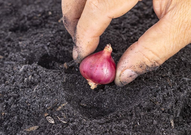 Po wybraniu miejsca i zaplanowaniu uprawy rozsyp odrobinę kompostu, wymieszaj go z ziemią i sadź cebulki ozime na głębokość ok. 5 cm. Odstępy pomiędzy roślinami zależą od kupionej odmiany — większe cebule będą potrzebować więcej przestrzeni. W przypadku obsadzania roślin korzeniowych rozstaw może być nieco mniejszy.