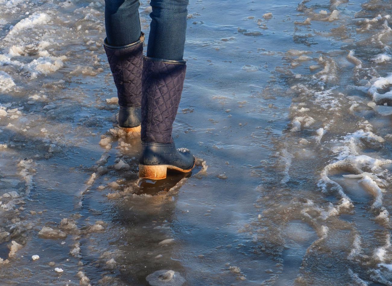 Sól chwilowo pomaga usunąć lód z chodnika, ale szkodzi przy tym środowisku i niszczy obuwie. Fot. Vecteezy Images/CanvaPro