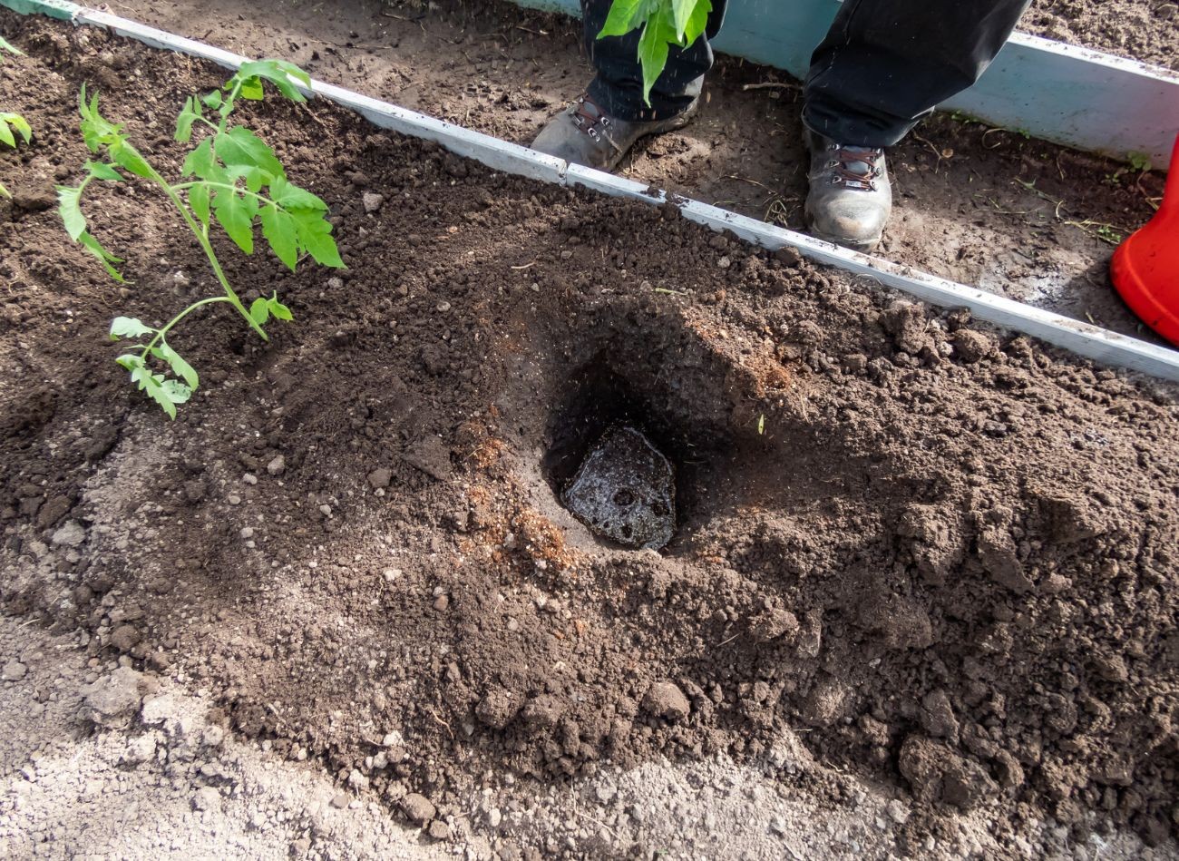 Pomidory, aby wydały obfity plon, potrzebują dobrej ziemi w bardzo niewielkim promieniu od pędu pomidora. Dlatego, jeżeli mamy ustalone, gdzie w ogródku pojawią się sadzonki, możemy przystąpić do przygotowania ziemi pod uprawę pomidorów. Na początek należy wbić patyk do pomidora w glebę. W jego promieniu o mniej więcej szerokości szpadla należy wykopać dołek na ok. 30 cm.