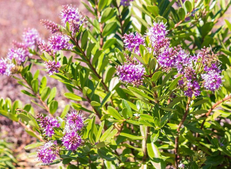 Hebe w trakcie kwitnienia przybiera różowe kwiaty. Fot.123RF.com