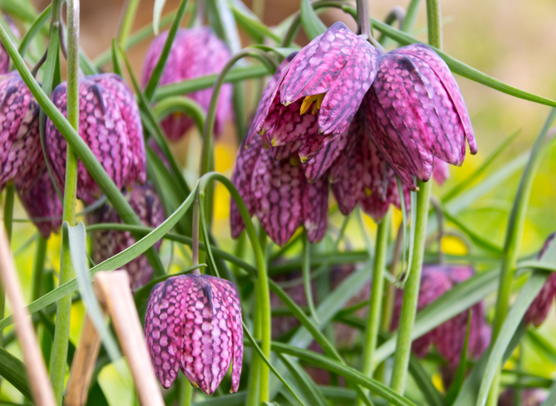 - Szachownica — ukazuje swoje charakterystyczne płatki w kwietniu i maju. Może mieć do 25 cm wysokości. Na szczytach pędów kwiatostanowych wyrastają dzwonkowate, średniej wielkości kwiaty pokryte wzorem w szachownicę.