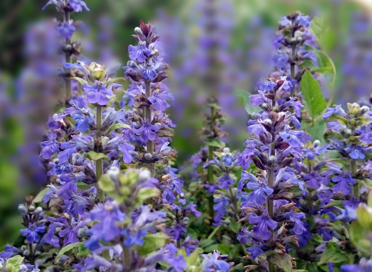 Kolejna bylina w zestawieniu, która szybko tworzy okrycie dla pustych miejsc na zacienionych rabatach. Jak wygląda? Dąbrówka rozłogowa to niska, płożąca roślina o ciemnozielonych, purpurowych lub brązowych liściach. Późną wiosną i wczesnym latem wytwarza drobne, niebieskie lub fioletowe (rzadziej białe) kwiaty. Osiąga wysokość od 10 do 20 cm.
