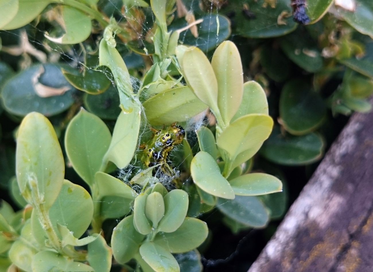 Zimujące larwy ćmy bukszpanowej zaczynają swoją aktywność bardzo wcześnie — już w drugiej połowie lutego lub na początku marca, gdy tylko ustępują pierwsze przymrozki. Młode osobniki, mierzące zaledwie 2 mm długości, początkowo pozostają niewidoczne: żerują wewnątrz gęstej korony krzewu, rozpoczynając od dolnej strony liści i środkowych partii pędów. W ciągu około czterech tygodni osiągają długość do 4 cm, zmieniają zabarwienie na zielonkawo-oliwkowe, a ich głowa staje się czarna i wyraźna. Już w tym stadium są zdolne do intensywnego żerowania. Pojedyncza gąsienica może zniszczyć nawet 40–45 cm² liści, a większe skupiska prowadzą do niemal całkowitego ogołocenia krzewów w ciągu kilku dni. Charakterystycznym śladem ich obecności są nitki przędzy i ciemne grudki odchodów przyklejone do zniszczonego listowia.