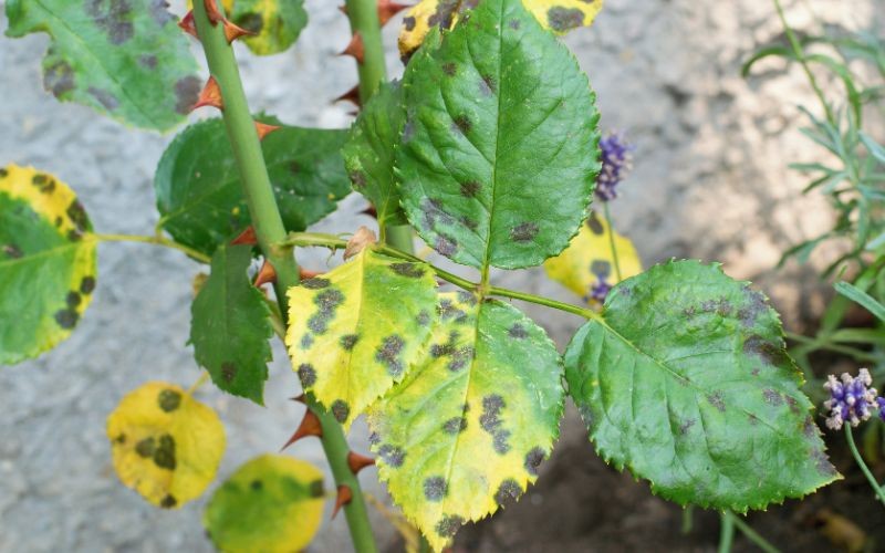 Czarna plamistość najczęściej atakuje róże latem. Zakażone fragmenty rośliny szybko stają się żółte i odpadają. Fot. Tunatura / Canva Pro