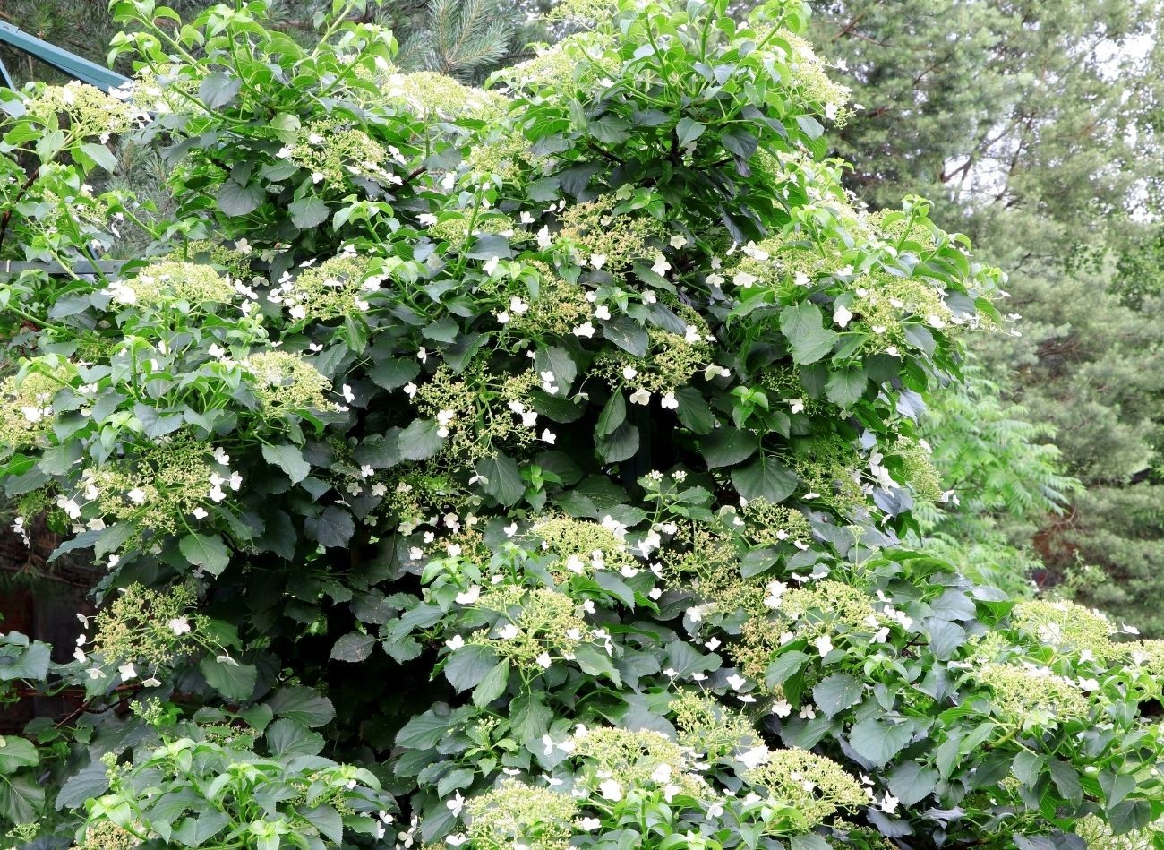 Ma duże, białe kwiaty zebrane w baldachogrona, które kwitną wiosną i latem. Dobrze rośnie w cieniu, co czyni je idealnym do miejsc mniej nasłonecznionych. Osiąga do 15 metrów wysokości, wspinając się za pomocą korzeni przybyszowych. Można sadzić ją zarówno wiosną, jak i jesienią. Wymaga regularnego podlewania i nawożenia.
