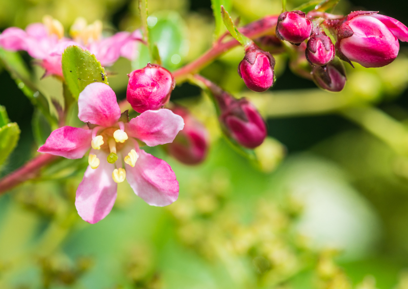 Twardziczka różowa „Apple Blossom” (Escallonia laevis) wyróżnia się delikatnymi, różowymi kwiatami z ciemniejszym środkiem, przypominającymi kwiaty jabłoni.