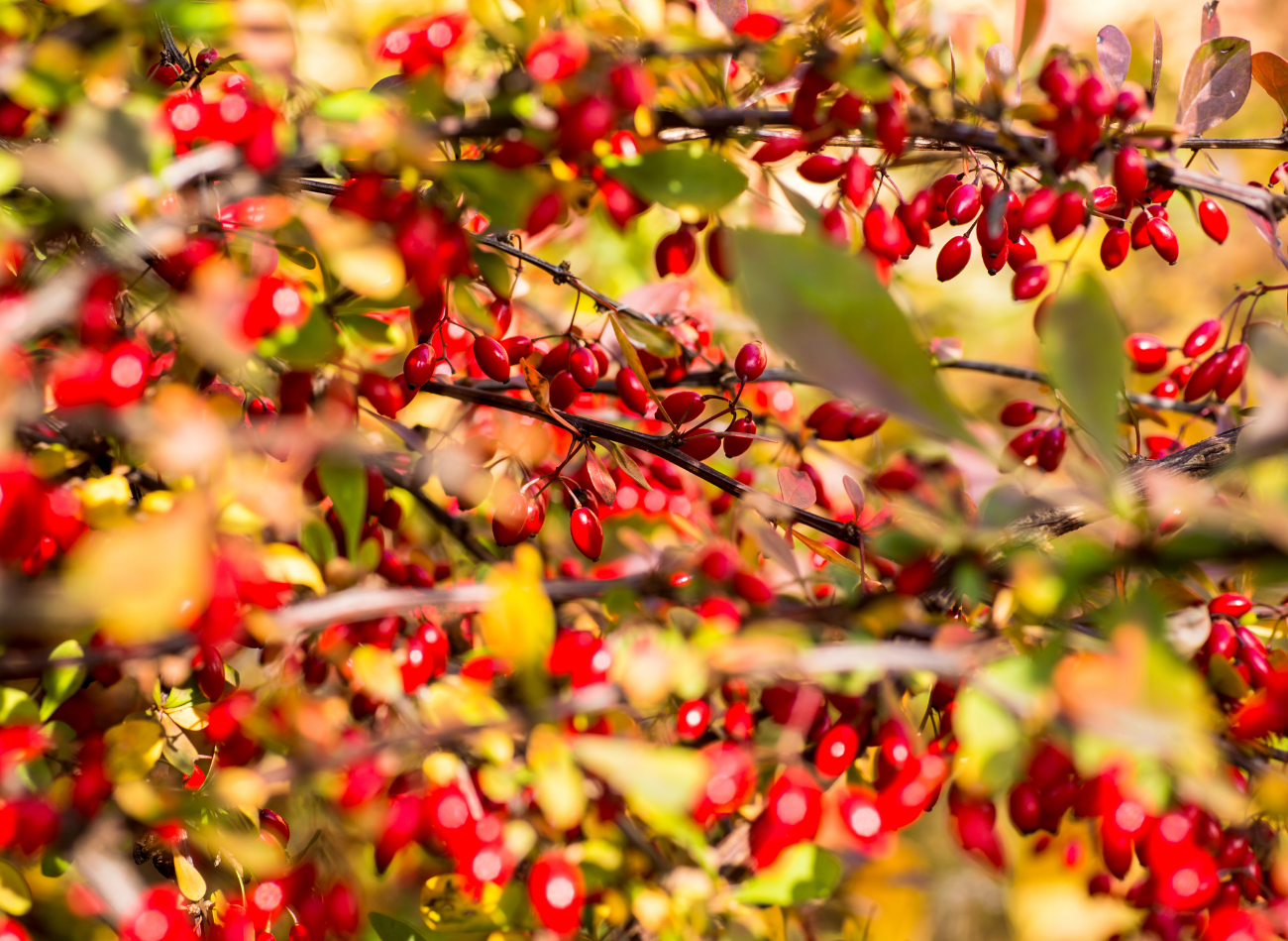 Ozdobą czerwonych berberysów są niewielkie czerwone owoce. Fot. Pexels