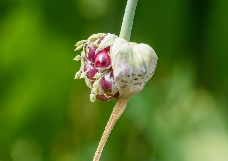 Większość ogrodników ogławia swój czosnek, ale jeśli planujesz rozmnażać roślinę z cebulek powietrznych, pozostaw na pędach kwiatostany. Z każdego takiego kwiatostanu można uzyskać nawet 20 sztuk tych niewielkich cebulek.