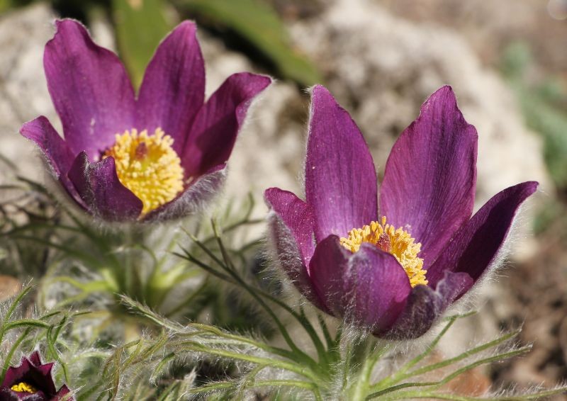 2. Sasanka zwyczajna — niska, skalna bylina o srebrzystych, pokrytych meszkiem liściach, które pomagają jej przetrwać mrozy. Uwielbia rosnąć w pełnym słońcu i bardzo przepuszczalnej glebie.