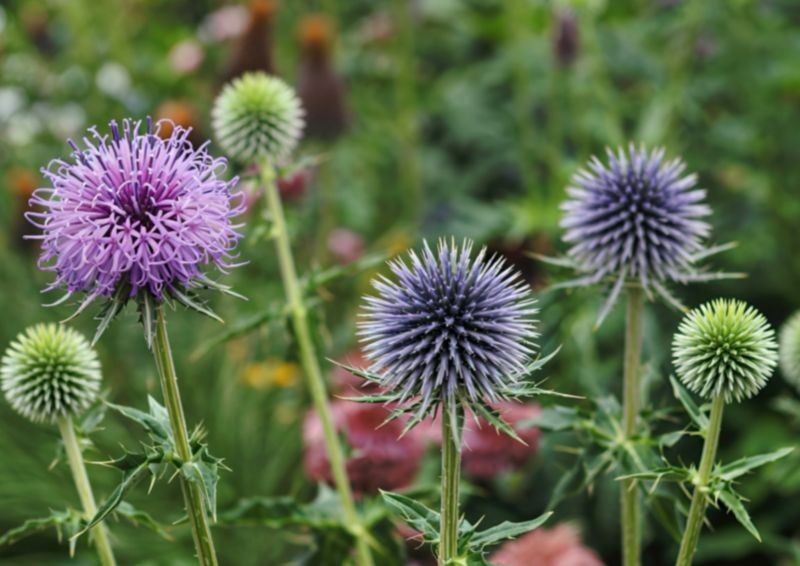7. Przegorzan — tworzy charakterystyczne, okrągłe kwiatostany w stalowoniebieskim kolorze, które wabią owady zapylające. Dobrze radzi sobie nawet w słabszych glebach i surowych warunkach. Ma niewielkie wymagania, dlatego jest łatwy w uprawie.
