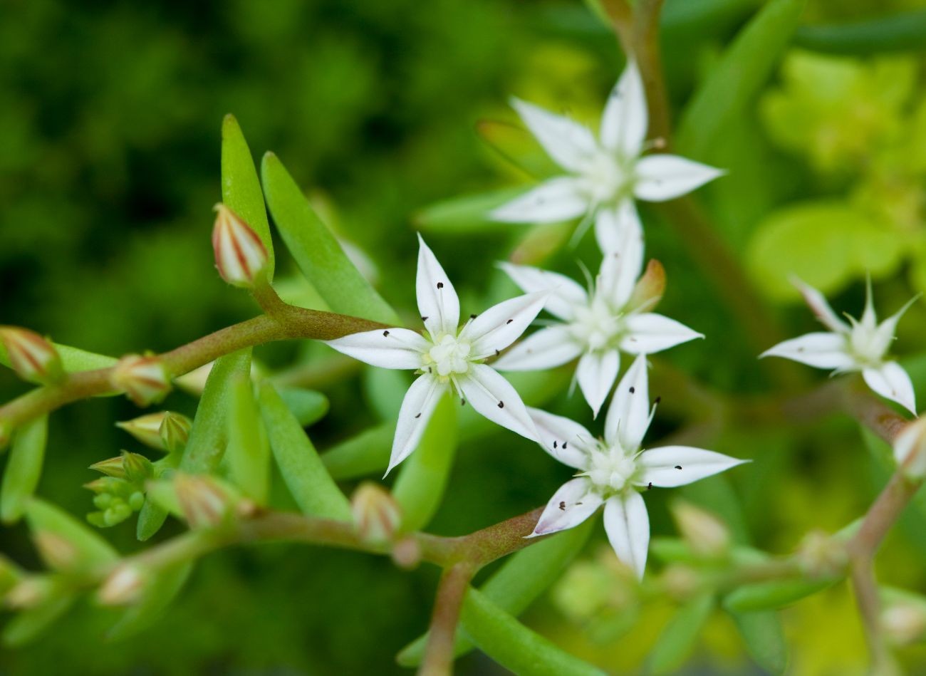 Wielkim atutem rozchodnika trójlistnego są białe, gwiazdkowate kwiaty. Fot. Nikolas J Klein/CanvaPro