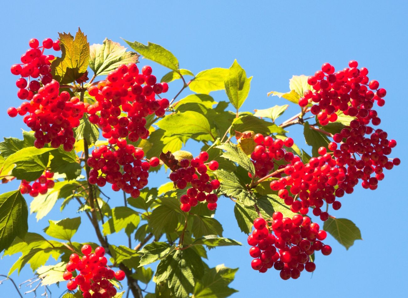 Krzew kaliny koralowej po przekwitnięciu pokrywa się efektownymi, soczyście czerwonymi owocami. Fot. ralphgillen/CanvaPro