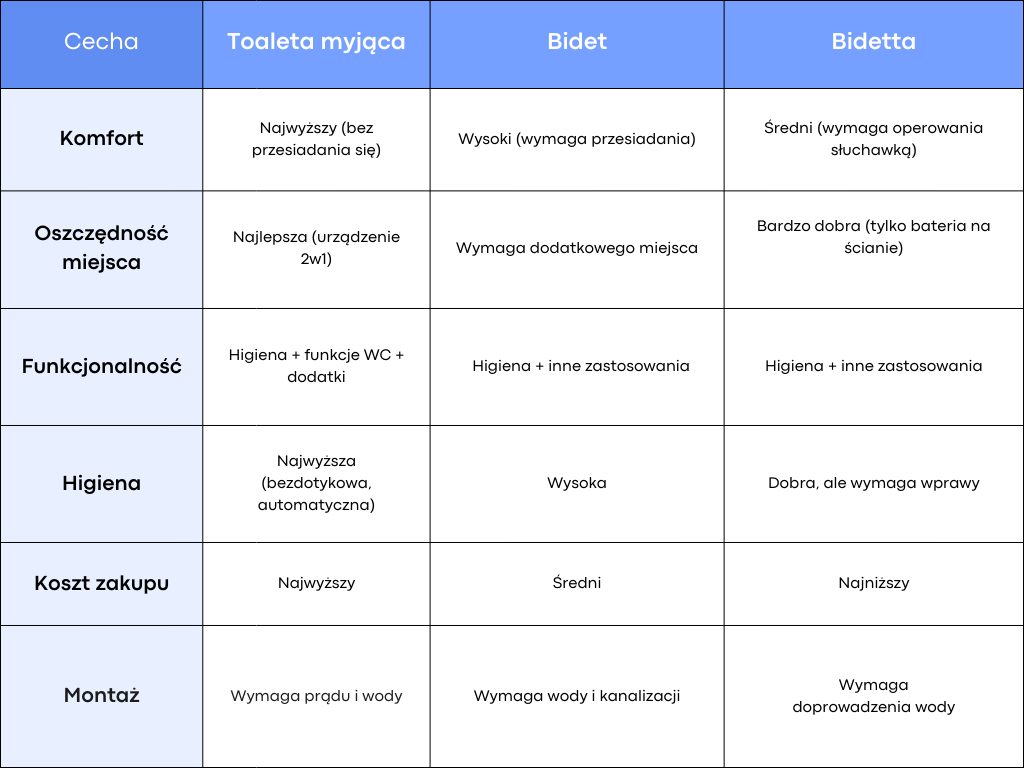 Toaleta myjąca, bidet czy bidetta - tabela porównawcza / materiały promocyjne