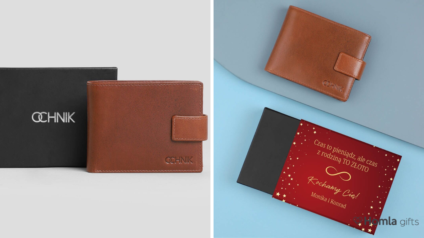 Dobrym prezentem świątecznym będzie elegancki skórzany portfel w opakowaniu z nadrukiem / materiały promocyjne