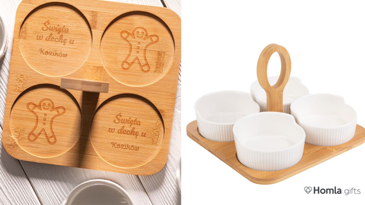 Chcesz wybrać idealny prezent na święta? Nic nie sprawdzi się tak, jak taca z miseczkami do serwowania przekąsek. Sprawdzi się doskonale, jeśli lubisz kupować prezenty, które są nie tylko praktyczne, ale i estetyczne. Miseczki przydadzą się do serwowania słodkich i słonych przekąsek na wigilijnym stole i podczas świątecznych spotkań z bliskimi. Na powierzchni tacy możesz wygrawerować własną personalizację z dedykacją i świątecznymi motywami.