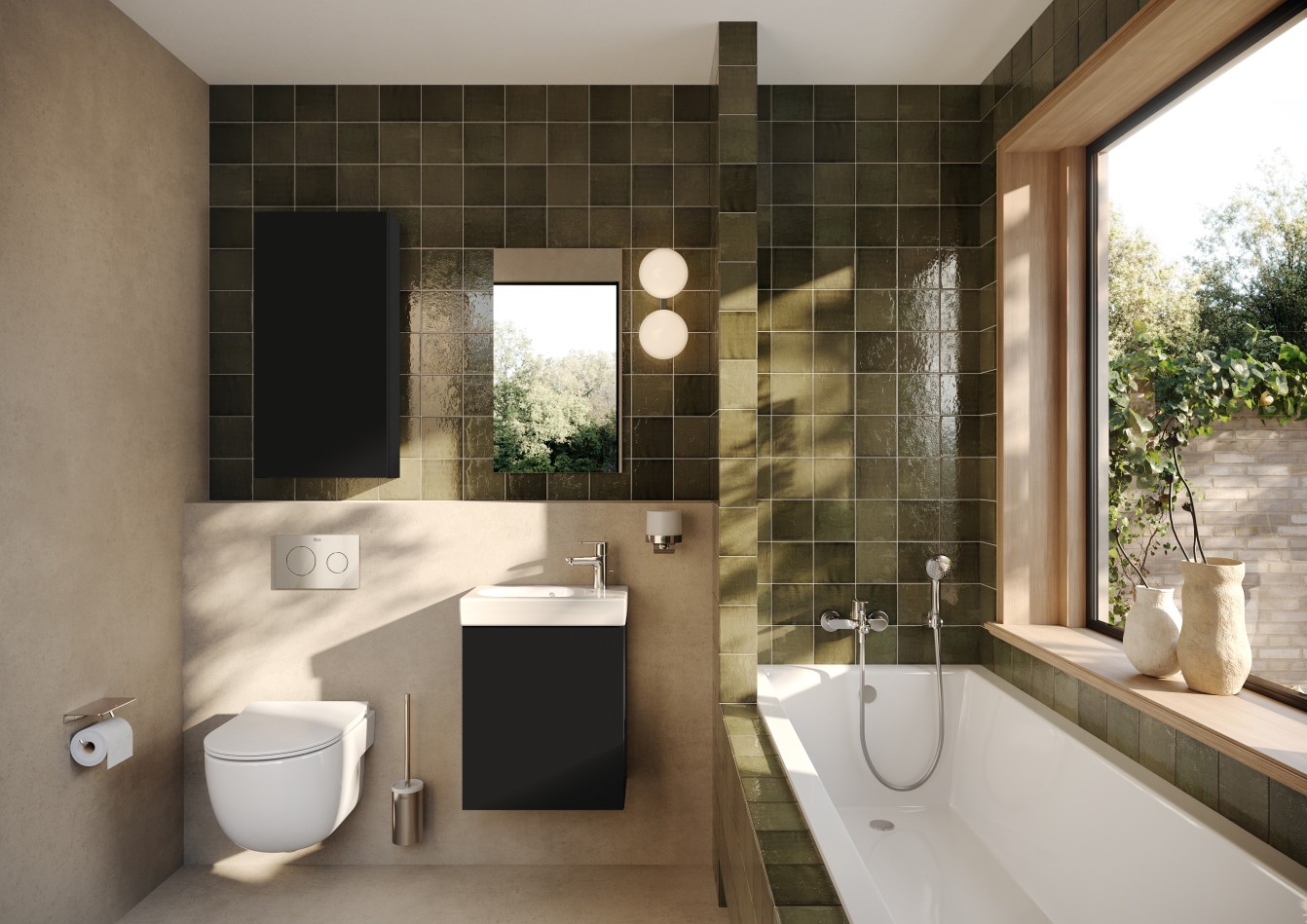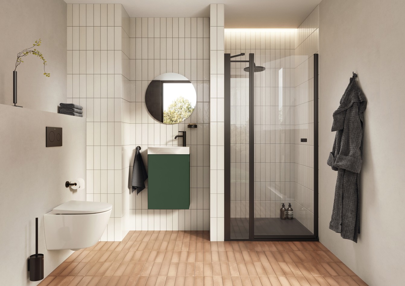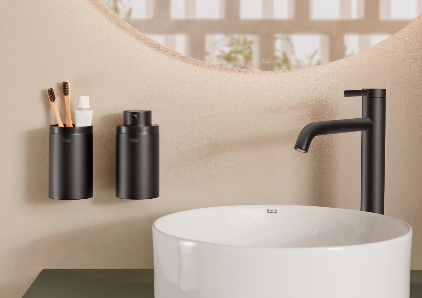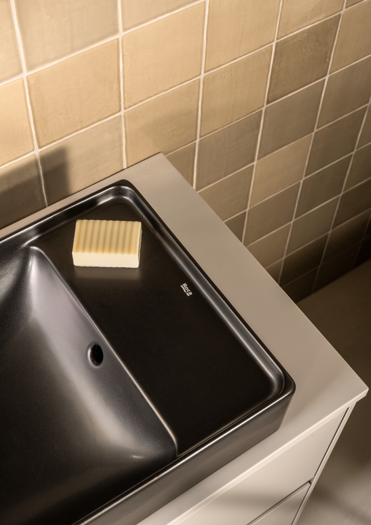 Matowa czerń to kolejny hit wśród kolorów łazienkowych. Jej wszechstronność i ponadczasowość sprawiają, że idealnie wpisuje się w różnorodne style – od minimalistycznego po industrialny. Baterie łazienkowe Cala, Ona czy akcesoria do łazienki z kolekcji Hotel’s (na zdjęciu z baterią Ona) w tym wykończeniu stają się subtelnym, ale wyrazistym akcentem, szczególnie w zestawieniu z kolorowymi meblami lub ceramiką z kolekcji Ohtake, dostępną w kilku odcieniach.
