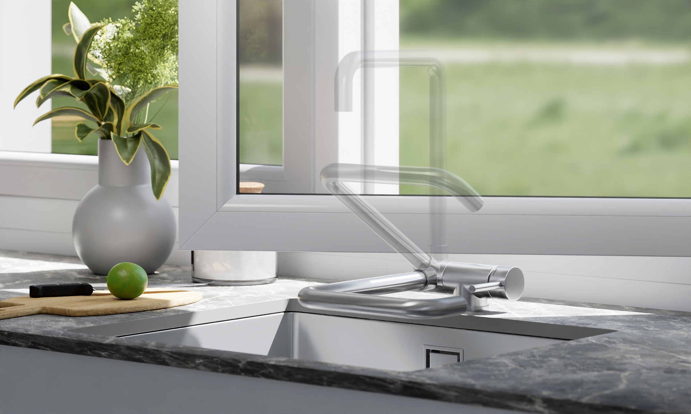 Baterie podokienne to rozwiązanie idealne do kuchni, gdzie zlew znajduje się bezpośrednio pod oknem. Model Theta II to przykład baterii, która niemalże całkowicie „znika”, gdy chcemy otworzyć okno. Dzięki składanej wylewce, która obraca się w zakresie 90°, bateria z łatwością składa się do wysokości zaledwie 6,6 cm, nie blokując okna podczas otwierania. Taka konstrukcja to doskonałe rozwiązanie, jeśli chcemy cieszyć się pełnym dostępem do widoku za oknem lub potrzebujemy przewietrzyć pomieszczenie. Oprócz tego model wyposażono w obrotową wylewkę i wydłużoną rączkę, co zapewnia komfortowe użytkowanie. Bateria, która potrafi się schować na zawołanie – to prawdziwa „kuchenna iluzja”, ułatwiająca aranżację przestrzeni.