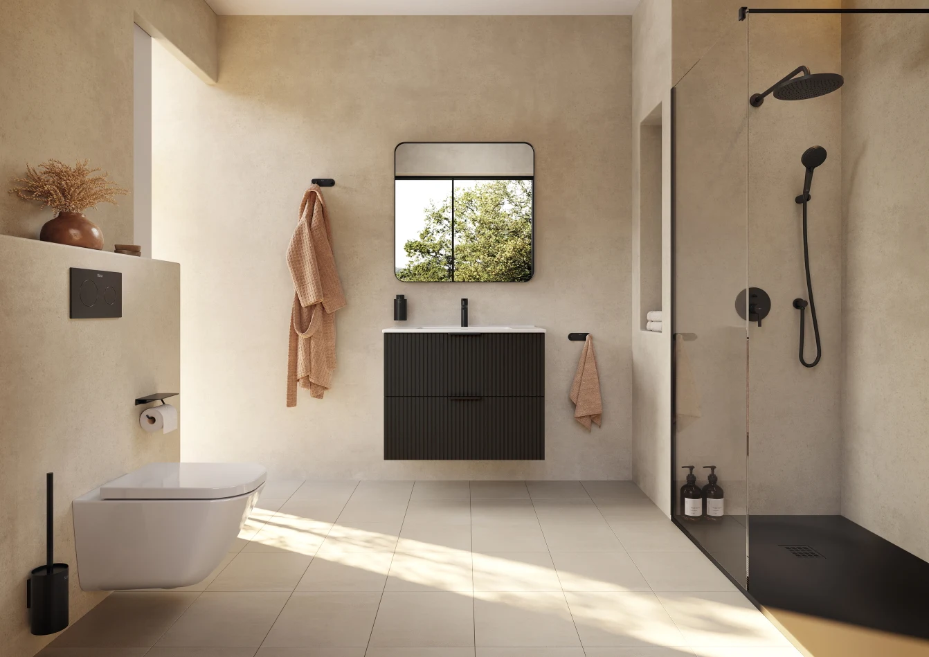 Matowa czerń to kolejny hit wśród kolorów łazienkowych. Jej wszechstronność i ponadczasowość sprawiają, że idealnie wpisuje się w różnorodne style – od minimalistycznego po industrialny. Baterie łazienkowe Cala, Ona czy akcesoria do łazienki z kolekcji Hotel’s (na zdjęciu z baterią Ona) w tym wykończeniu stają się subtelnym, ale wyrazistym akcentem, szczególnie w zestawieniu z kolorowymi meblami lub ceramiką z kolekcji Ohtake, dostępną w kilku odcieniach.
