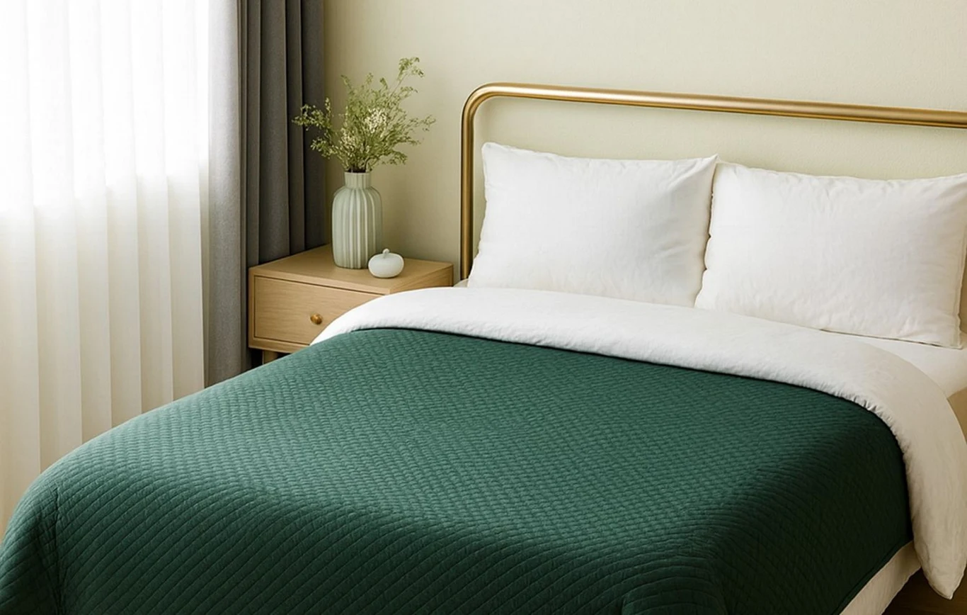 Gładkie narzuty można zobaczyć na łóżkach w sypialniach skandynawskich i nowoczesnych. Ich prostota daje efekt uporządkowania przestrzeni.