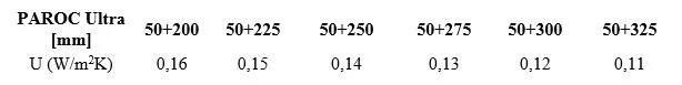 Tabela: Współczynnik przenikania ciepła U (W/m2K) dla dachów skośnych w drewnianej konstrukcji szkieletowej przy wykorzystaniu płyt izolacyjnych PAROC Ultra o różnej grubości: