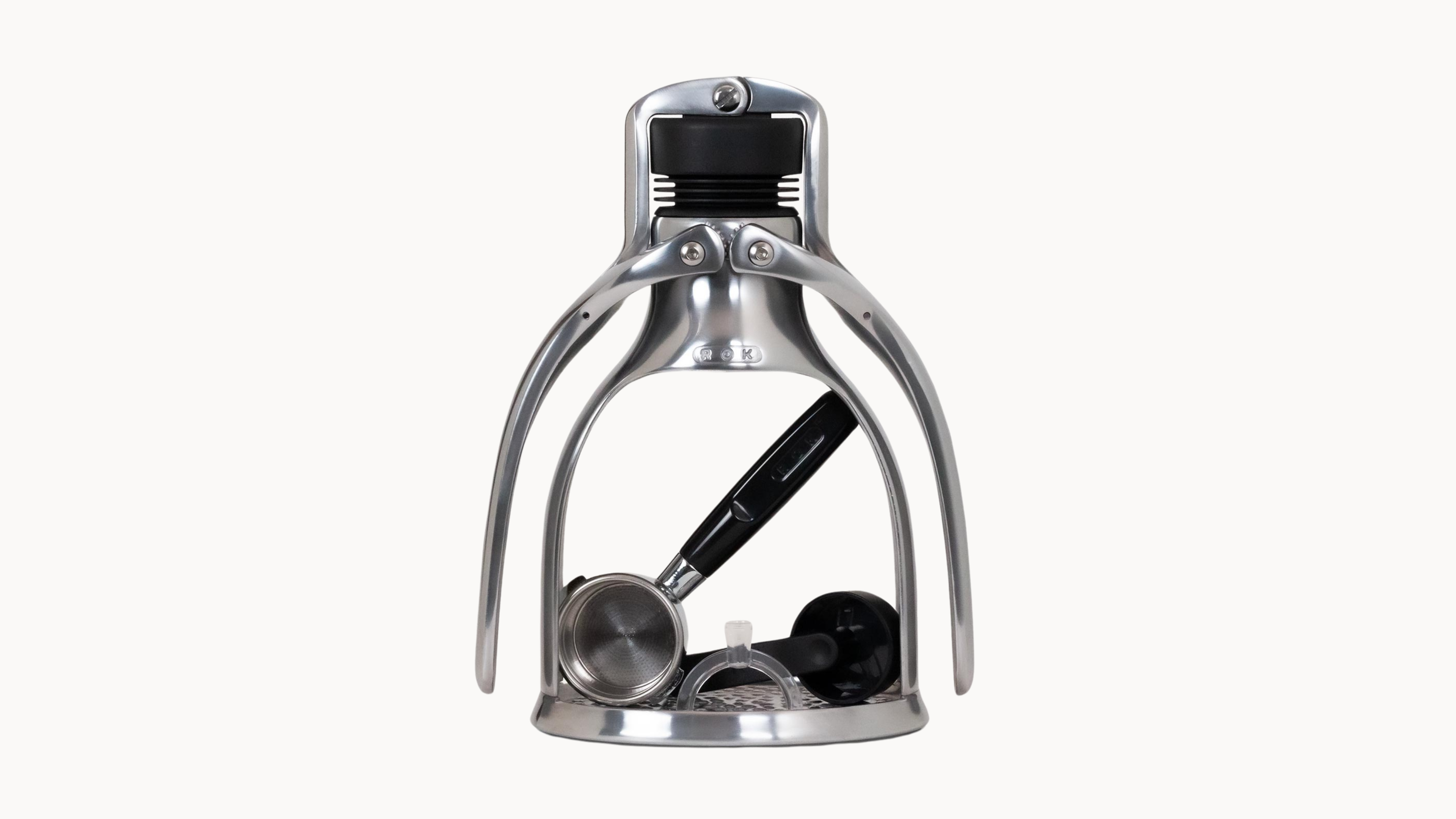 ROK to ostatni ekspres nieelektryczny na naszej liście. Ta legendarna konstrukcja wśród miłośników kawy zyskała już status legendy. Jest wykonany z aluminium, stali i kompozytu szkła i ponownie składa się właściwie jedynie z portafiltra, grupy zaparzającej oraz pompy napędzanej siłą dwóch ramion, za pomocą których własnoręcznie przepychamy wodę przez powierzchnię kawy.