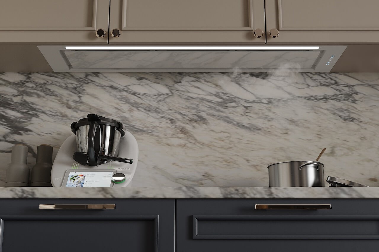 Okap podszafkowy o szerokości 120 cm to doskonałe rozwiązanie, ponieważ skutecznie wchłania opary ze sprzętów obok, zapobiegając osadzaniu się tłuszczu na szafkach. Dzięki temu kuchnia pozostaje czystsza i bardziej higieniczna / materiał promocyjny