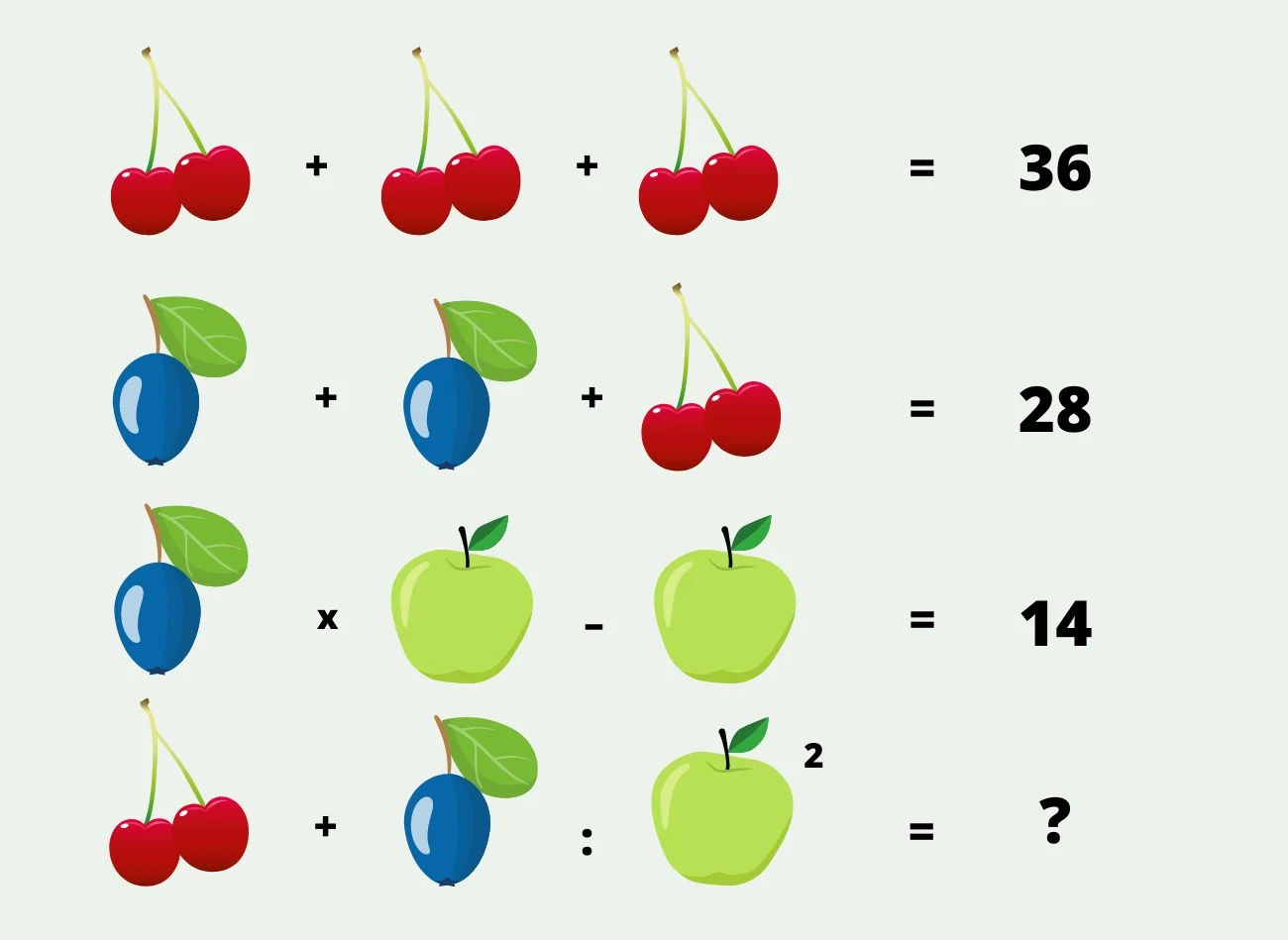 Spójrz na obrazek widoczny poniżej. Przedstawia on smakowite wiśnie, śliwki oraz jabłka. Każdy owoc symbolizuje inną liczbę, którą odkryjemy, rozwiązując kolejne równania. Podczas wykonywania obliczeń zmierz czas, jakiego potrzebujesz do podania wyniku. Największe bystrzaki rozwiązują naszą zagadkę matematyczną w 20 sekund! Sprawdź, czy należysz do grona najlepszych.