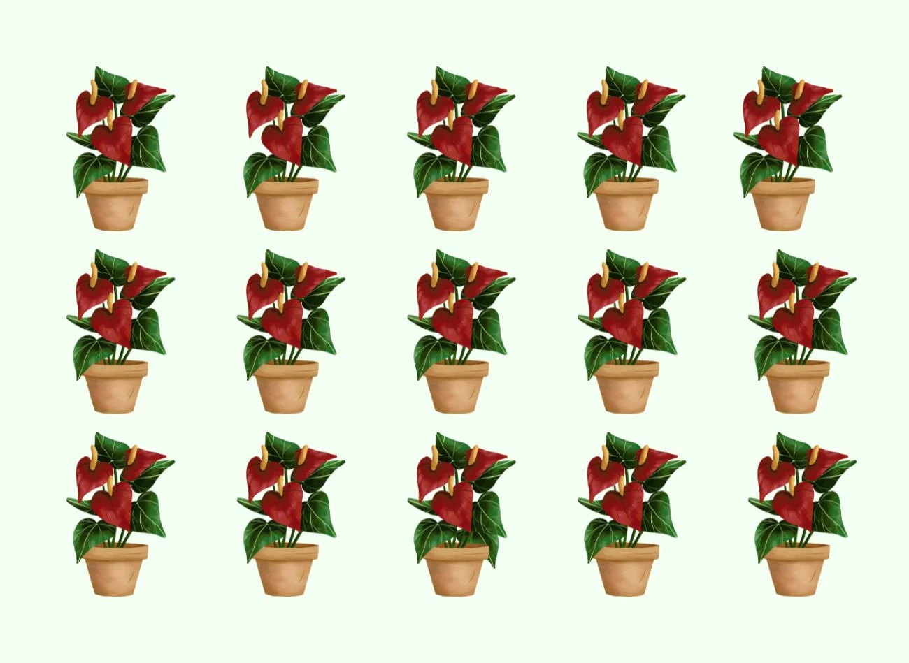 Zadanie nie należy jednak do najłatwiejszych. Na rysunkach zobaczysz 15 niemal identycznych roślin doniczkowych. Choć na pierwszy rzut oka mogą wydawać się takie same, są między nimi 2 różnice, dlatego dobrze się przyjrzyj. Zwróć uwagę na detale, ale nie trać za dużo czasu. Najbardziej spostrzegawczy rozwiązują naszą zagadkę w zaledwie 15 sekund! Czy dołączysz do grona najlepszych? Wskaż 2 anturia, które różnią się od pozostałych.