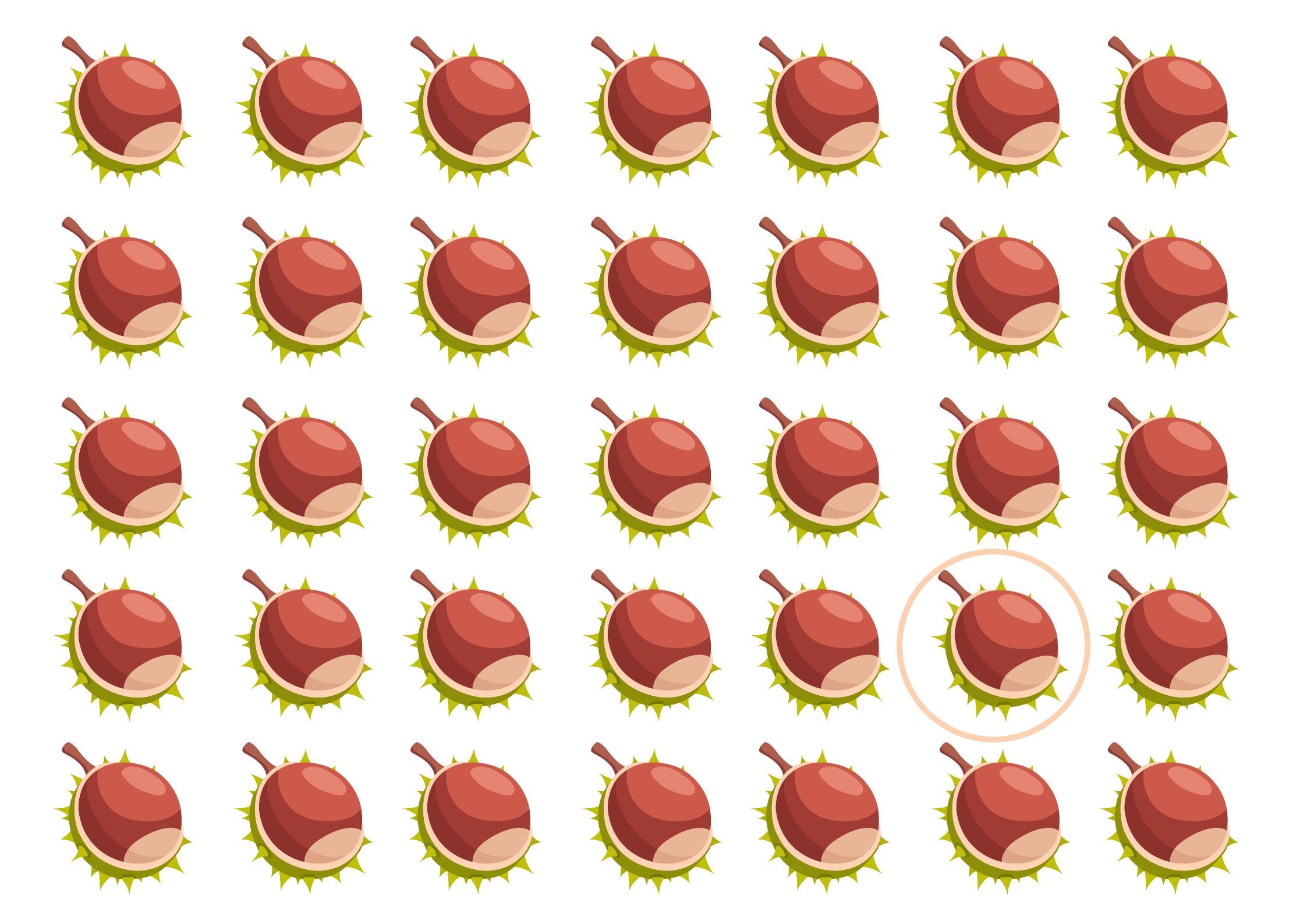 Na zdjęciu widzisz 35 kasztanów. Są identyczne, ale wśród nich trafił się jeden "oryginał". Przyjrzyj się dobrze, bo różnica może być niewielka. Sokole oko wypatrzy innego kasztana w 20 sekund. Oczywiście mogą pojawić się trudności, niektórym będzie potrzeba więcej czasu na znalezienie kasztana, który różni się od pozostałych. Spróbujesz?