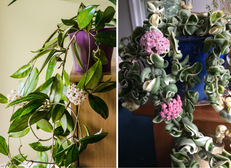 - Hoya carnosa Variegata lub Hoya bella Albomarginata, których liście mają białe brzegi,