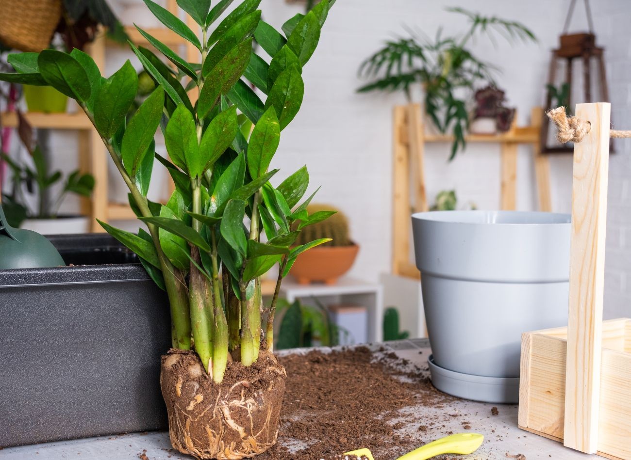 Wystające z ziemi bulwiaste kłącza zamiokulkasa wskazują na konieczność przesadzenia rośliny. Fot. Ольга Симонова/CanvaPro