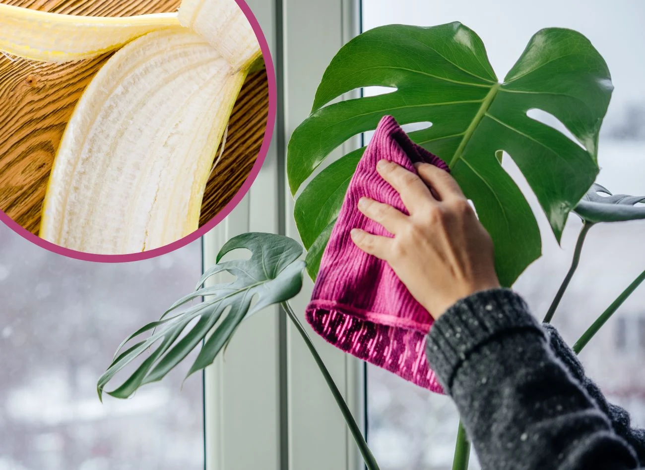 - skórka banana – aby nabłyszczyć liście, delikatnie pocieramy je wewnętrzną stroną skórki bananowej.