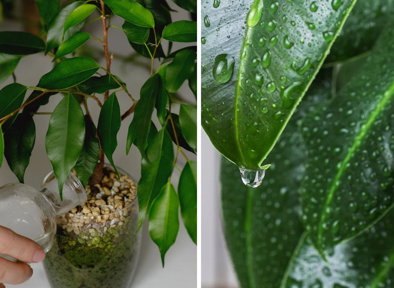 Fikusy uwielbiają czyszczenie liści. W przypadku benjamina najlepiej jest zabezpieczyć glebę i spryskać go wodą z prysznica. Liście figowca sprężystego powinny być regularnie przemywane. To ułatwi roślinie procesy fotosyntezy i oczyszczanie powietrza, a także pomoże pozbyć się szkodników. Liście fikusa przemywaj letnią, odstaną wodą, do której możesz dodać kilka kropli płynu do naczyń. Utworzy to na liściach film, który zapobiegnie przyklejaniu się zabrudzeń i szkodników.