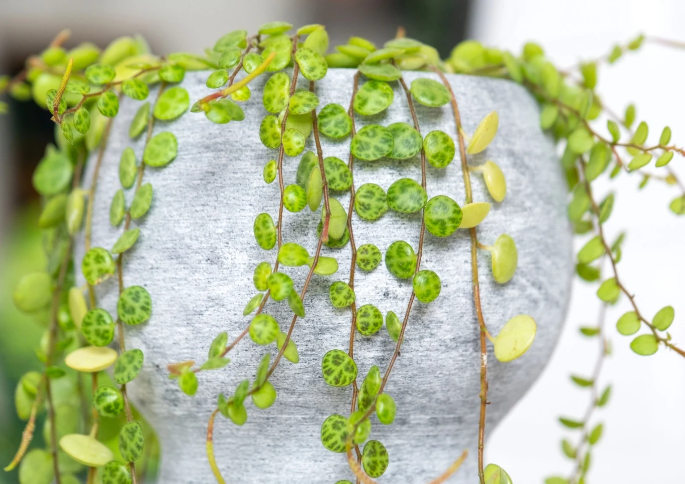 Wytwarza długie, zwisające pędy, które mogą osiągać nawet 30 cm długości. Wyrastają na nich liczne, zielone, okrągłe listki. Ten gatunek pochodzi z tropików i rośnie w wilgotnym środowisku jako epifit. Warto to wziąć pod uwagę przy planowaniu uprawy, bo trzeba zapewnić mu podobne warunki.
