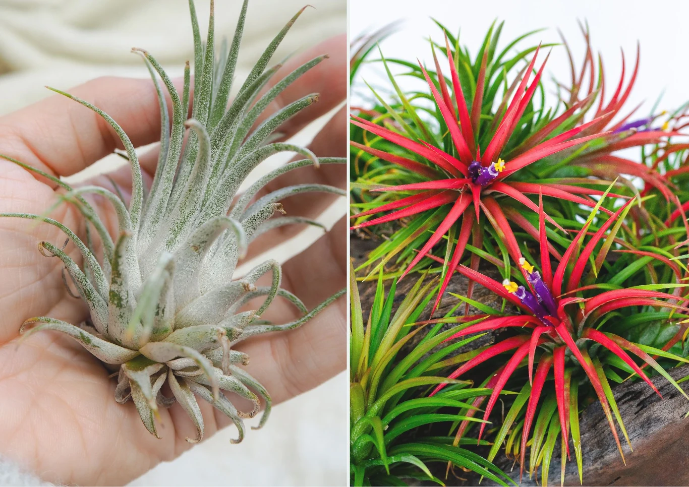 Tillandsia ionantha to często kupowana roślina do mieszkań. Mierzy 10-15 cm, a jej cechą charakterystyczną są rynienkowate liście o srebrzystozielonej barwie. Przy odmianie 'Rubra' końce liści mają purpurowy odcień, natomiast u 'Fuego' zauważymy zaczerwienione końcówki. Z kolei 'Scaposa' jest skręconą rozetą, a jej kwiaty są pojedyncze, drobne i rurkowate o fioletowym kolorze.