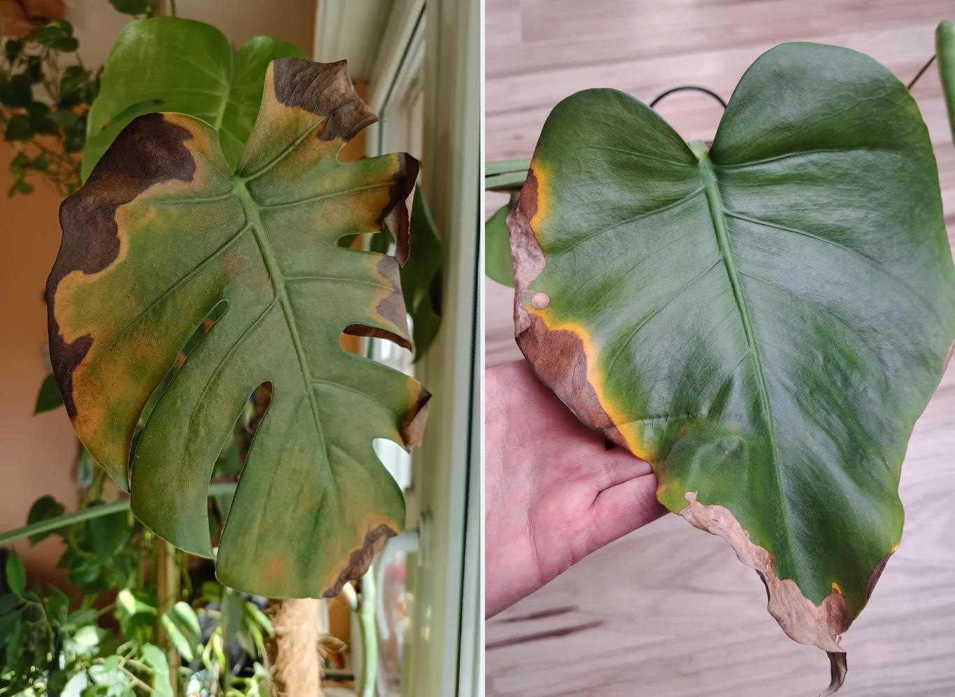 - Nadmiar słońca – monstera preferuje jasne, ale nie bezpośrednio nasłonecznione stanowiska. Zbyt intensywne promienie słoneczne mogą spowodować oparzenia liści, które objawiają się jako brązowe plamy.