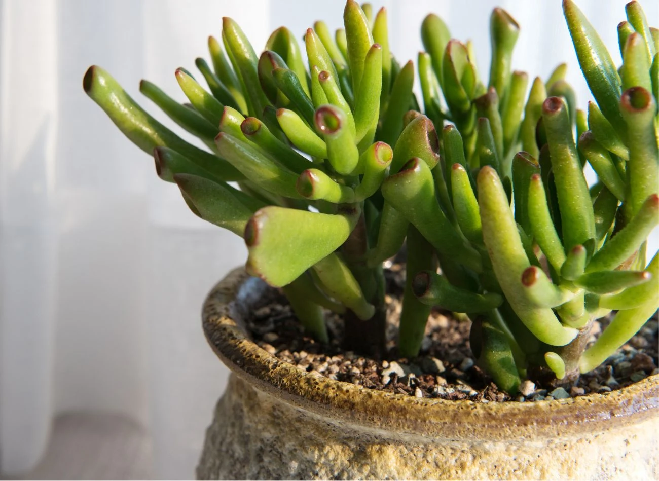 Grubosz Gollum nie jest rośliną trudną w uprawie. Pod jednym warunkiem: że zapewnimy mu odpowiednie warunki. Szybko jednak uspokajamy: jako sukulent preferuje on suche środowisko i jest w stanie wytrzymać długie okresy bez podlewania.