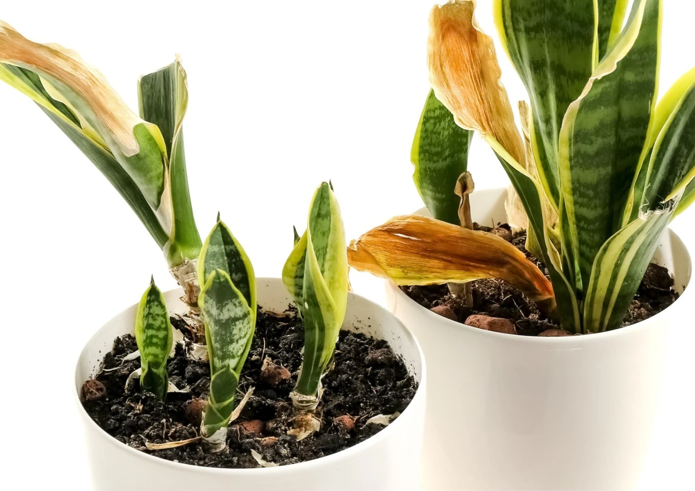 Suche i zniekształcone liście sansewierii mogą być sygnałem, że umiera ona z powodu braku wody. Jeżeli podłoże mocno się przesuszy, trzeba roślinę obficie podlewać przez jakiś czas, aż liście wrócą do normy i przybiorą ładny kształt. Oczywiście nie należy jej przesadzać, natomiast warto uważać, by z kolei nie przelać wężownicy. Wtedy na liściach mogą pojawić się białe lub żółte plamy.