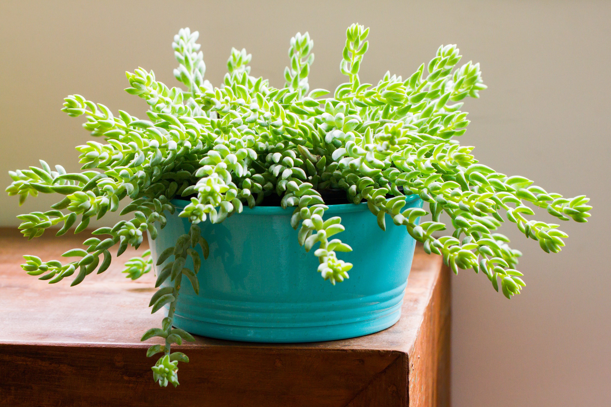 - rozchodnik Morgana – pięknie prezentuje się w koszu wiszącym. Charakteryzują go zaokrąglające się, szaro-zielone lub szaro-niebieskie liście, których długość może wynosić nawet 50 cm. Ten meksykański sukulent lubi średnią lub wysoką temperaturę. Aby jego uprawa przebiegła pomyślnie, należy zrobić przerwę między podlewaniami, tak aby gleba lekko się wysuszyła. Podczas zimowania najlepiej pozostawić glebę delikatnie suchą. Ten sukulent kwitnie stosunkowo rzadko. Jeśli tak się stanie, rozpoznasz go latem po różowych lub czerwonych kwiatach. Roślina ta preferuje jasne światło, jednak nie może być ono zbyt ostre. W przeciwnym razie promienie słoneczne mogą poparzyć liście rozchodnika;