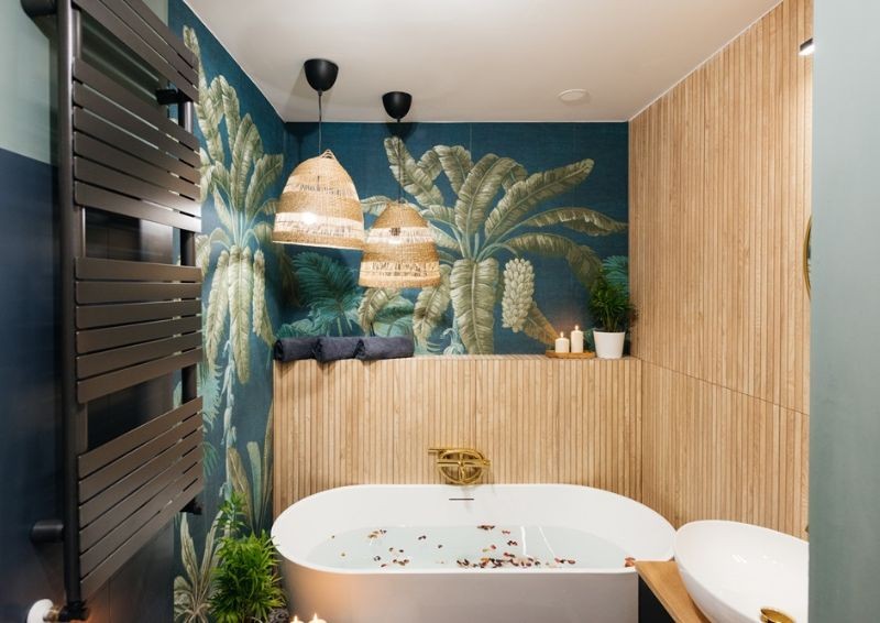 Sporą popularnością cieszy się też łączenie stylu boho i skandynawskiego. W takiej łazience proste, minimalistyczne elementy wyposażenia zestawia się z kwiecistą tapetą z motywem dżungli i dodatkami z bambusu czy też imitującymi drewno.