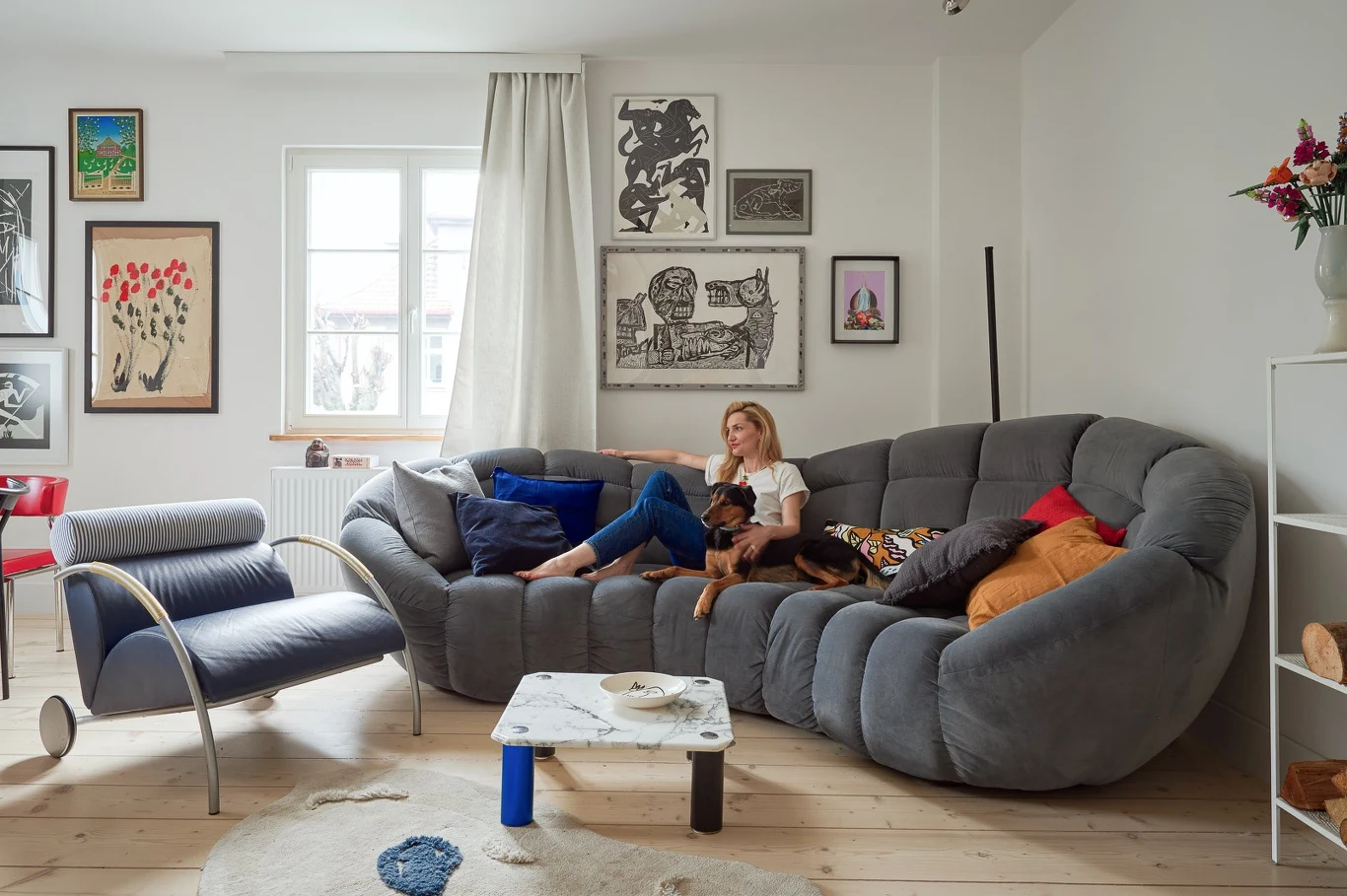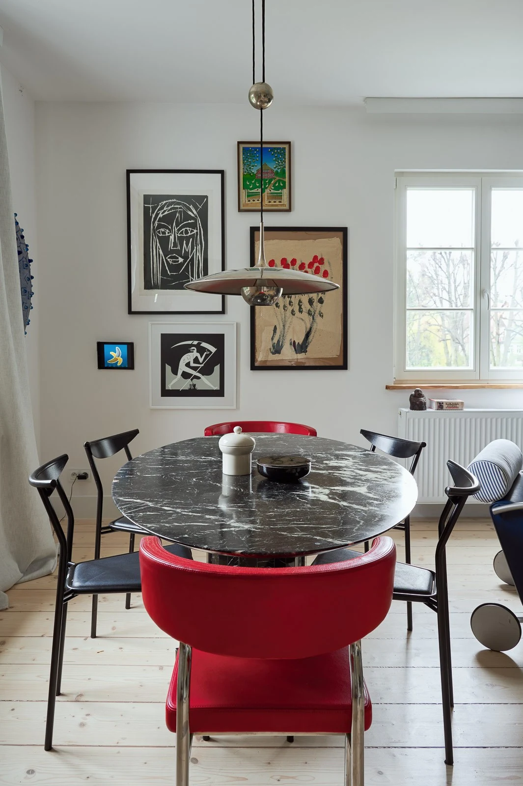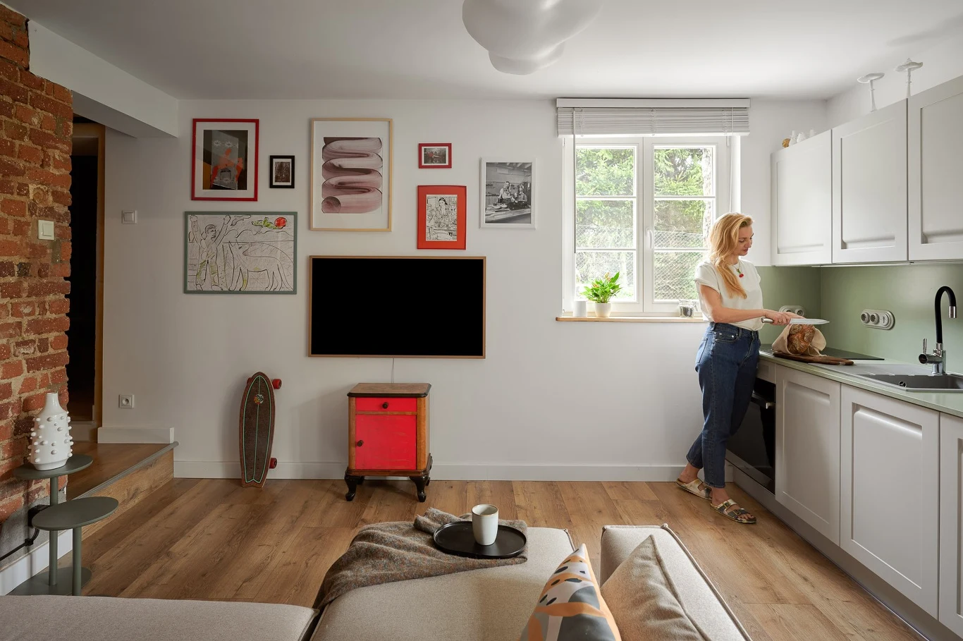 Na zewnątrz dom zachował się praktycznie w oryginalnym stanie, bo znajduje się pod opieką lokalnego konserwatora zabytków. W środku widać dużo współczesnej polskiej sztuki, rzeźby i meblarskie perełki z lat 80. Podczas remontu priorytetem było zachowanie jak największej ilości oryginalnych elementów domu, starych podłóg, czy wykusza w sypialni. Nawet parapety są zrobione z desek, które były wcześniej częściami okien.