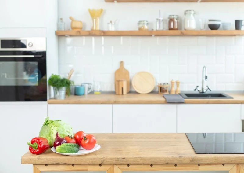 Kuchnia w stylu skandynawskimnie obejdzie się też bez akcentów z drewna. Najlepiej wybrać jego naturalne odcienie, na przykład jasny jesion, miodową brzozę lub ciepły dąb. Możesz umieścić drewniane elementy na blatach, stołach, a nawet na ścianach.