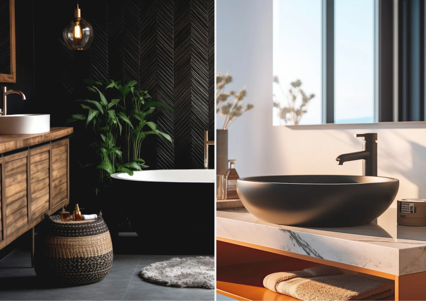 - black on black – wolnostojąca czarna wanna na czarnej podłodze albo czarna umywalka nablatowa zamontowana na marmurowym, żyłowanym blacie to połączenia odważne, wyraziste i niebanalne; trzeba jednak pamiętać, że sprawdzą się tylko w dużych łazienkach,
