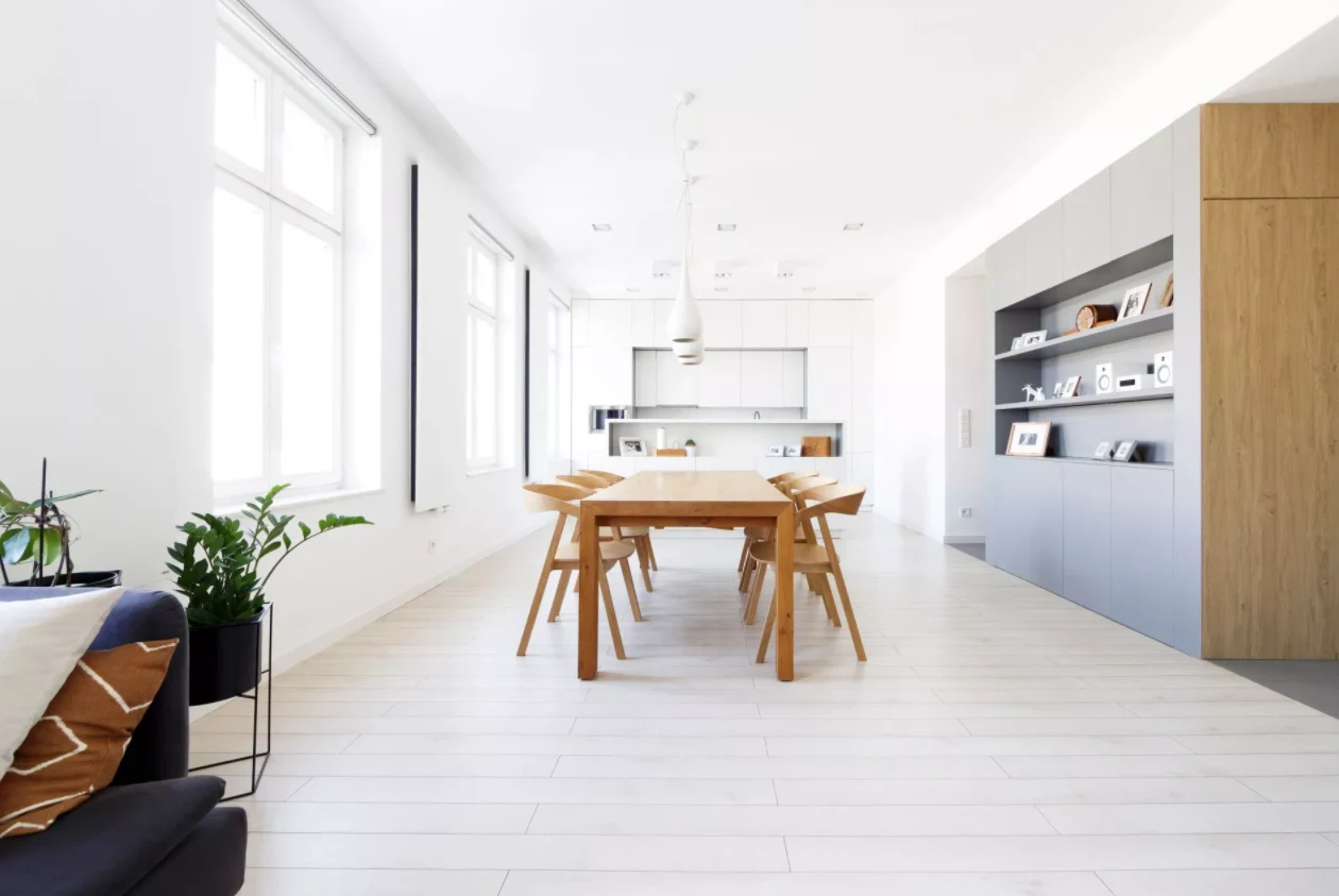 Strefa dzienna jest otwarta, przestronna i jasna. Komfortowa dla mieszkańców, ale również sprzyjająca spotkaniom z przyjaciółmi i rodziną. Otwarta kuchnia, duży stół zajmujący centralne miejsce w salonie i wygodna część wypoczynkowa to najważniejsze jej elementy. Część nocna natomiast jest bardziej schowana i prywatna.