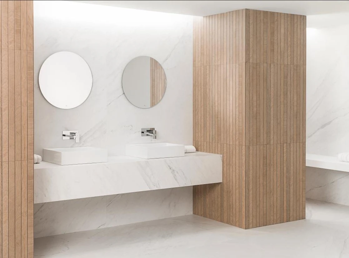 Imitacja drewna rewelacyjnie komponuje się także z płytkami nawiązującymi do szlachetnych minerałów takich, jak onyks, czy jadeit, z którymi tworzy elegancką, wręcz ekskluzywną przestrzeń.