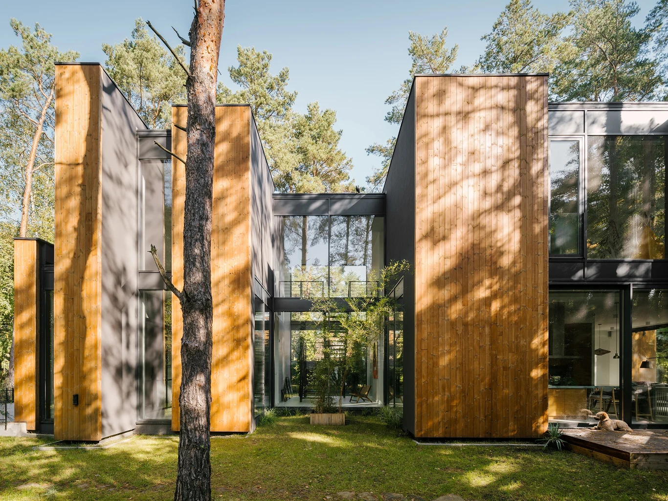 Elewacja budynku jest dopasowana kolorystycznie do lasu sosnowego, a jej krawędzie są obłożone drewnopodobnymi płytami. Frontową część domu tworzy jednolita ściana bez okien pokryta w całości deskami. Ukryty w niej jest także wjazd do garażu podziemnego.