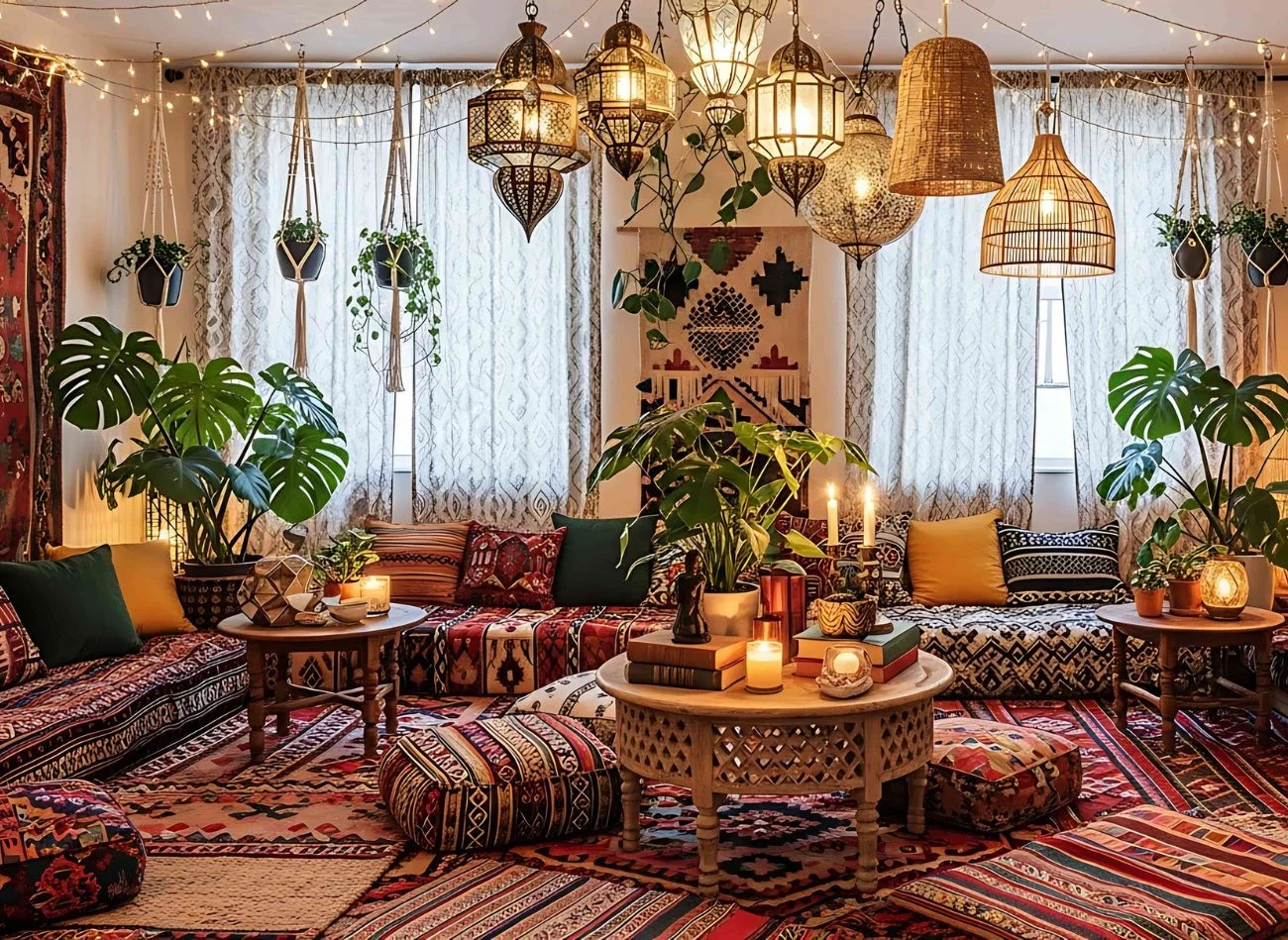 Charakterystycznym elementem są także wzory – geometryczne, roślinne lub zwierzęce, inspirowane sztuką plemienną Afryki, motywami orientalnymi z Azji czy wzorami Indian z Ameryki Południowej. Paleta kolorystyczna jest zazwyczaj ciepła i nasycona – od barw ziemi (brązy, beże, terakoty) po intensywne odcienie turkusu, czerwieni czy pomarańczu, w zależności od regionu, którym się inspirujesz.