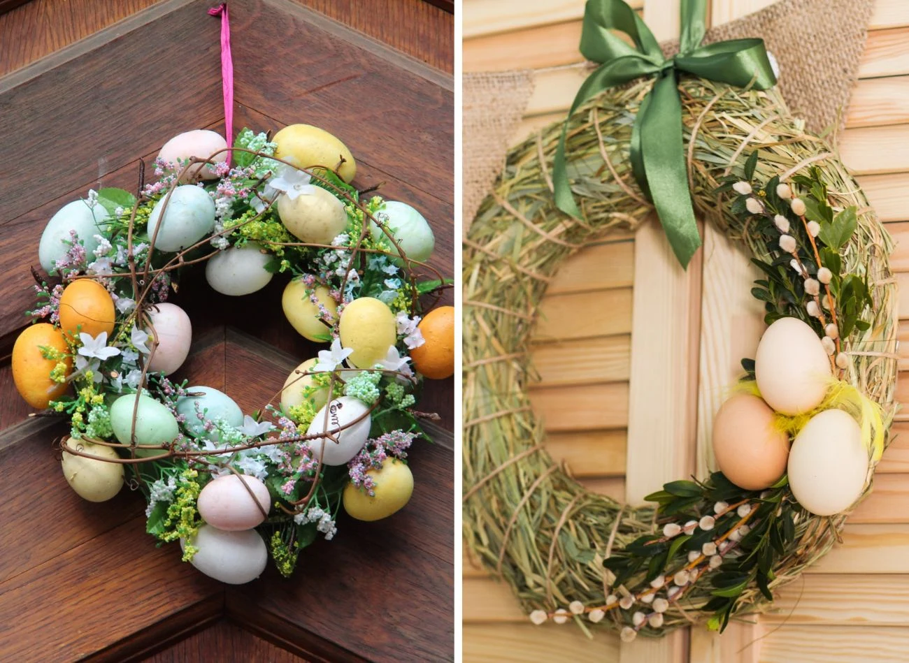 Główną obręcz możemy udekorować w minimalistycznym stylu, nawiązując do piękna natury, wówczas postawimy na ziemiste kolory, pastele, jutowe elementy, wierzbowe gałązki, jajka barwione na brąz i zdobione woskiem oraz kremowe kokardy. Możemy też dać się ponieść wiosennej radości, obwiązując obręcz gałązkami bukszpanu, na których zawiesimy kolorowe mini pisanki, dołożymy kwiatowe akcenty w kolorach żółtym, różowym, filetowym i czerwonym. Jeśli decydujemy się na materiałową wstążkę jako zawieszkę, możemy spróbować przenieść jej wzór na pisanki, aby stworzyć harmonijną dekorację, w której wszystko do siebie pasuje.