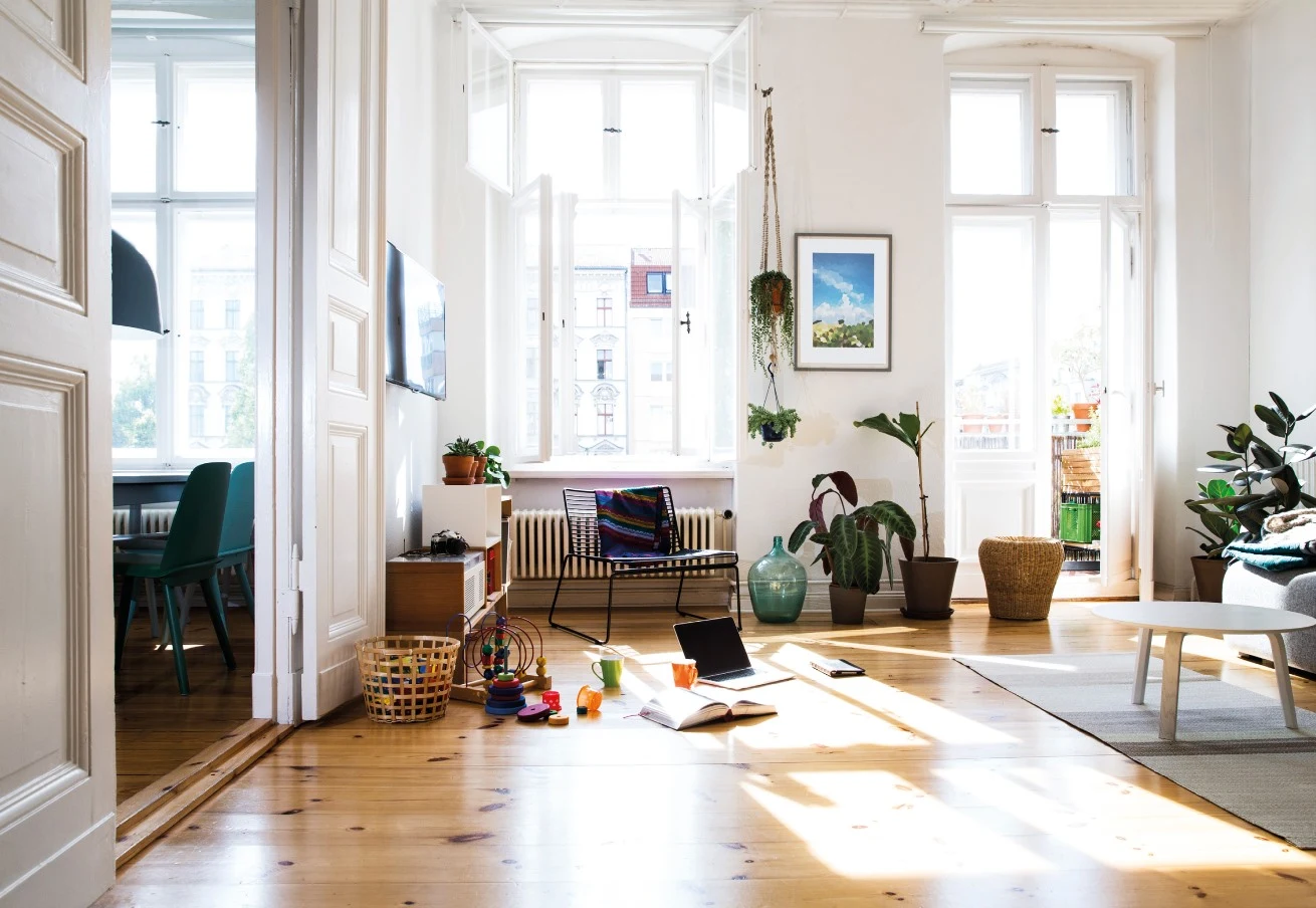 Ściany pomalowane farbą Tikkurila Nature White w zestawieniu z dużymi oknami efektownie rozświetlą salon, potęgując wrażenie przestronności. Czysta biel świetnie dogaduje się z naturalnymi materiałami, stworzy więc zgrany duet z drewnem czy wikliną. Lekkość i swobodę aranżacji podbiją rozstawione na podłodze zielone rośliny. W wystrój kapitalnie wkomponują się białe podwójne drzwi, które w wersji przesuwnej nie zabiorą przestrzeni we wnętrzu.